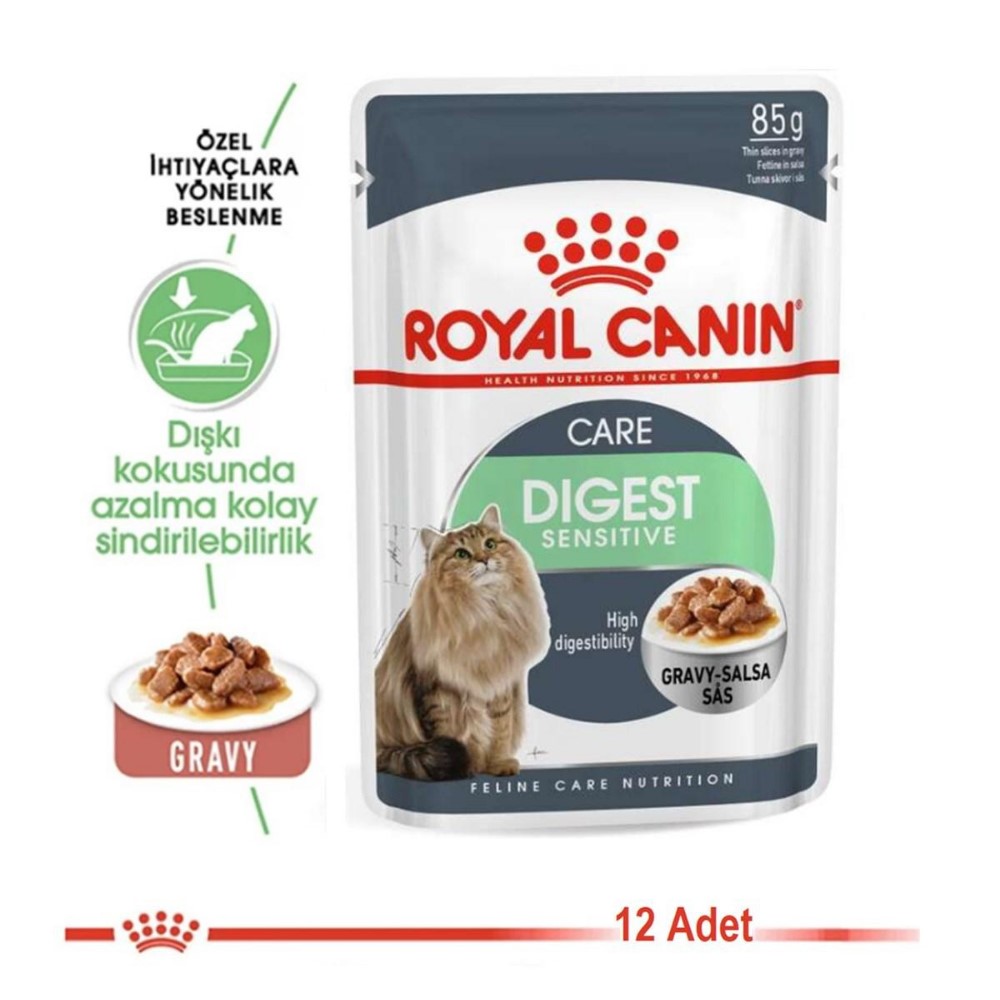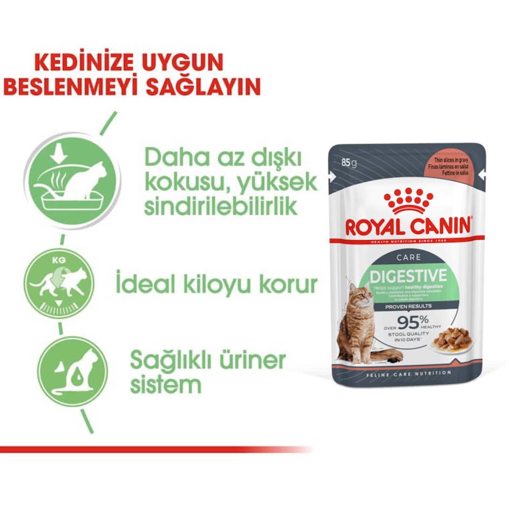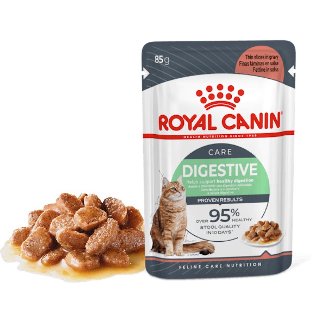ROYAL CANIN® Digestive Care Gravy, sağlıklı sindirimi desteklemek için özel olarak tasarlanmış, besin ögesi açısından eksiksiz ve dengeli bir formüldür. Hassas bir şekilde dengelenmiş besin ögeleri sayesinde bu formül aynı zamanda sağlıklı dışkı kalitesinin desteklenmesine de yardımcı olur. ROYAL CANIN® Digestive Care'in kanıtlanmış sonuçları vardır. Çalışmamız*, katılımcı kedilerin Digestive Care beslenme programıyla (hem kuru mama hem de yaş mama formüllerini birleştiren) beslendikten sadece 10 gün sonra %95'in üzerinde sağlıklı dışkı kalitesi elde ettiğini gösterdi.