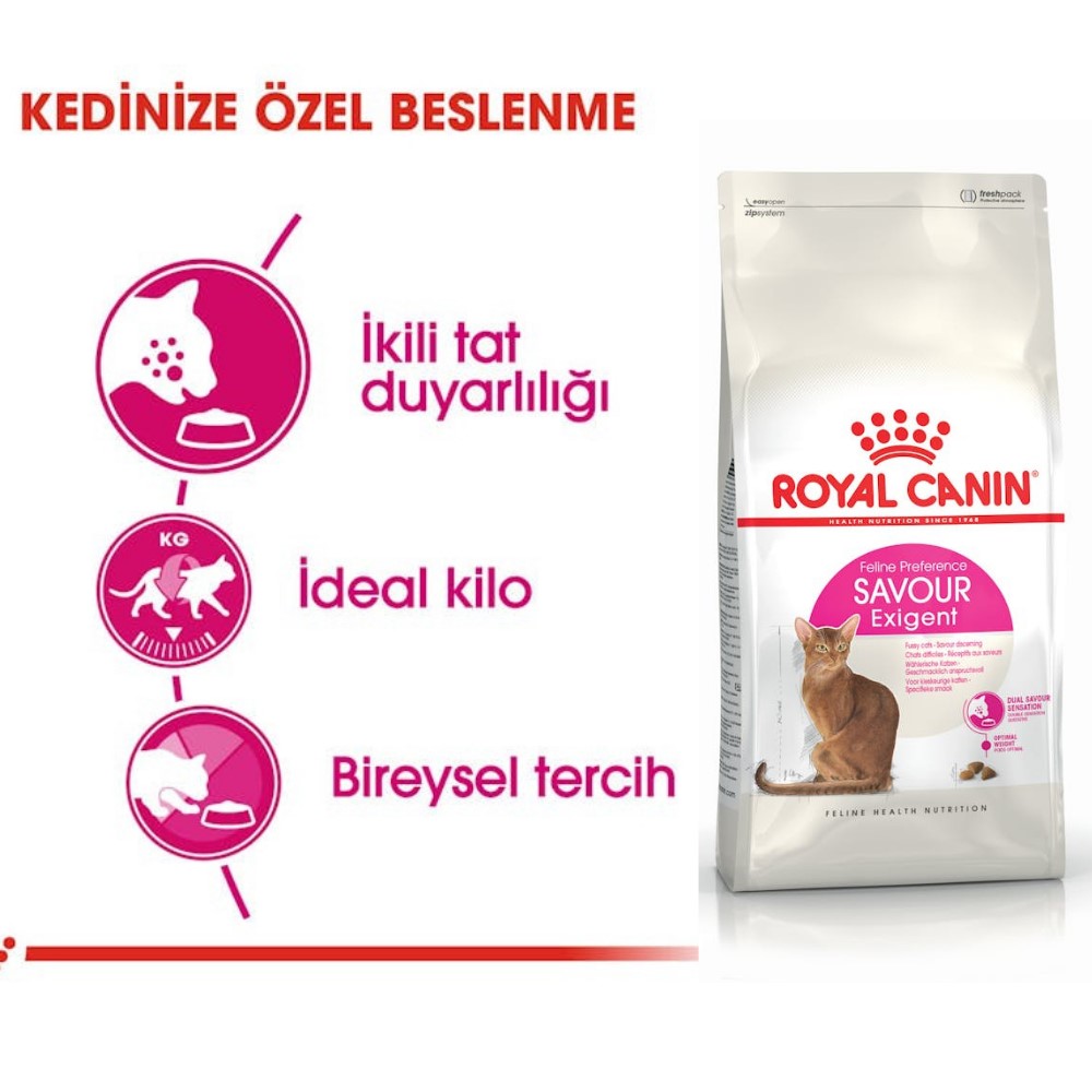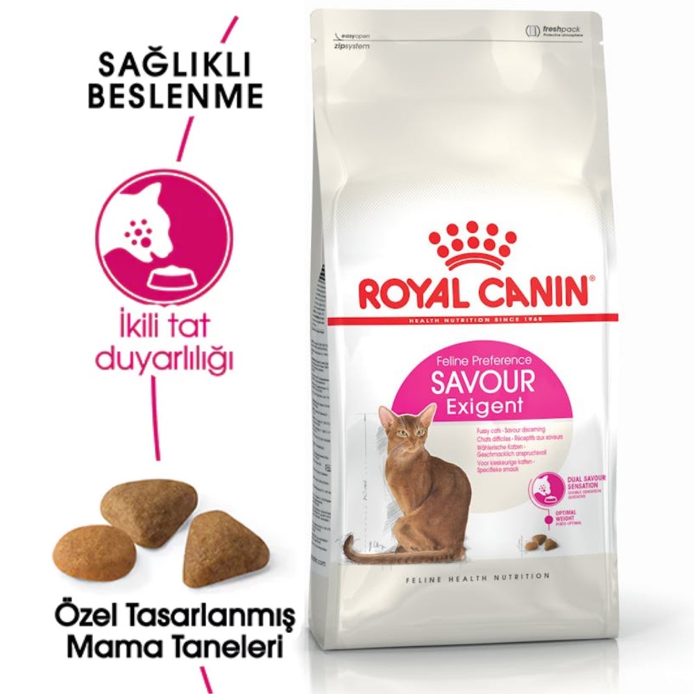 Yiyeceklerin ağızda yarattığı his, kedilerin belirli bir yiyeceği seçmesinde önemli bir faktördür. Her kedi yiyeceklerin aromasını ve dokusunu kendi tercihlerine göre yorumlar. Savour Exigent, zor beğenen ve yiyecekleri dokularına göre seçen 1 ila 7 yaş arası kedilere yöneliktir. Tüy güzelliğini destekler. İdeal kilonun korunmasına yardımcı olur. Farklı mama tanesi dokularına sahiptir.